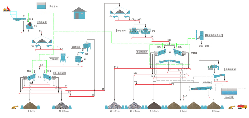 該生產(chǎn)線破碎系統(tǒng)分為三級破碎,用戶可根據(jù)具體物料的大小,省去部分破碎設(shè)備,最終獲得符合一定比例要求和相關(guān)質(zhì)量要求的精品碎石和機(jī)制砂。