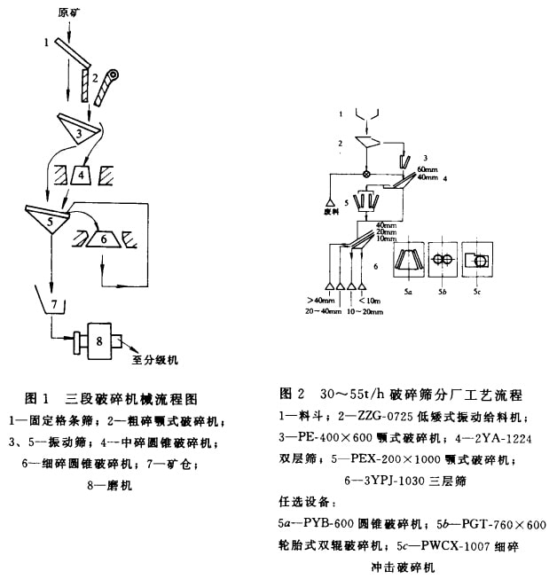 土石質(zhì)原料加工。破碎石料的目的是為工業(yè)制備各種不同粒度要求的碎石。按不同使用目的,根據(jù)產(chǎn)量及最終粒度組成要求,由料斗、給料機(jī)、破碎機(jī)、篩分機(jī)和轉(zhuǎn)運(yùn)、堆集物料用的各種皮帶運(yùn)輸機(jī)組成不同的破碎工藝流程。圖2、圖3列舉了生產(chǎn)能力為30一55t/h和200一250t/h采石場(chǎng)的破碎篩分的典型工藝流程。