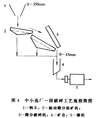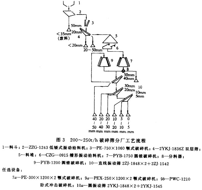圖4為中、小選廠采用篩分破碎機(jī)一段破碎的工藝流程簡(jiǎn)圖;圖5為采用兩臺(tái)篩分破碎機(jī)將最大750mm的石料破碎成4種粒度的兩段破碎的工藝流程簡(jiǎn)圖。