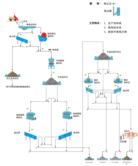 當水泥礦山廢石二氧化硅含量高于10%或原料抗壓強度過高時,應采用圓錐破碎機、立式整形制砂機為主 的生產工藝,生產效率高,使用成本低,但工藝流程長,設備投資較大。