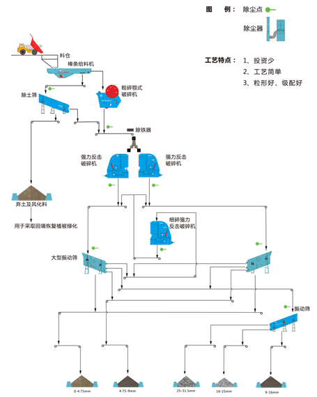 對于礦山廢石二氧化硅含量低于10%的原料加工,可采用強力反擊破為主的生產線加工水泥礦山廢石(見下 工藝圖),該工藝具有投資少、工藝簡單,產品粒形、級配好等特點。