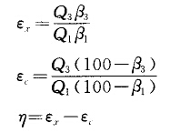 式中:η為篩分效率,%;Q1、Q2、Q3為入篩、篩上、篩廠固體廢物重量,Q1= Q2十Q3;β1、β2、β3為入篩、篩上、篩下固體廢物中小于篩孔的細(xì)粒累積含量,%; εx、εc為細(xì)粒采收率、粗粒采收率。
