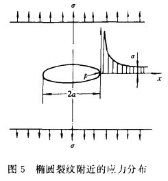 圖5表示一個橢圓裂紋附近的應力分布情況。從圖可見,在離孔遠處,應力分布受孔的干擾很小,基本上是均勻分布的。在長軸的兩端點上,有高度應力集中,而在短軸兩側,應力被卸除,形成低壓區(qū)。當橢圓的短軸長度衰減至零時,便是一條長度為2α√σπ的裂紋。當ρ≤α時,最大應力為: