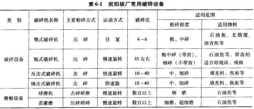 在破碎過(guò)程中,破碎機(jī)進(jìn)口物料粒度與出口物料粒度之比稱為粉碎比或破碎比。破碎比大小與粉碎設(shè)備特性、物科特性以及工藝要求和產(chǎn)量有關(guān)。破碎比過(guò)大,會(huì)使物料過(guò)分研磨或破碎,使小粒度增加,粒度分布不合理,產(chǎn)量下降i破砷比過(guò)小,也會(huì)使破碎的物料粒度不合要求,并增加破碎次數(shù)。炭陽(yáng)極廠常用的破碎設(shè)備及特性見(jiàn)表6—1。
