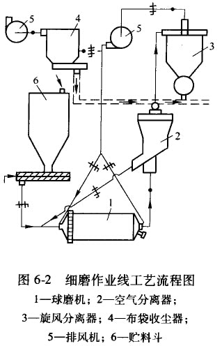 閉路循環(huán)細(xì)磨作業(yè)線中(圖6—2),除球磨機(jī)外,還包括:粗粒分離用的字氣分離器、旋風(fēng)分離器(大部分粉料在其中沉降并從中排出)、對氣流進(jìn)行最后除塵用的布裳收塵器以及排風(fēng)機(jī)。