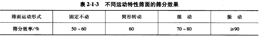 (1)篩面運動形式。篩面運動形式關(guān)系到篩上物料層的松散度及需要透篩的細(xì)物料相對篩面運動的速度、方向、頻率等,因而對分層、透篩過程均合影響。例如,物料在固定篩上的運動,全靠物料在其本身重力的作用下滑移流動,篩分效果較差;在振動篩上,物料的運動能量主要來自篩面的振動,料層不斷地充分松散,顆粒相對篩面不斷地劇烈沖撞,篩分效果較好:轉(zhuǎn)筒篩運動平緩,料層松散度不夠,粗、細(xì)顆粒經(jīng)常混雜,使分層不連續(xù),物料相對篩面的運動速度較小,篩孔容易堵塞;搖動篩上的物料主要是沿篩面方向滑動,在篩面法向的速度分量較小,不利于細(xì)粒透篩。幾種典型篩子的篩分效率大致如表2-1-3所示。