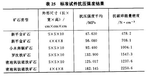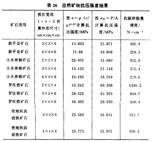 考察巖礦抗壓強(qiáng)度的整個測定過程,可以斷定所測定的標(biāo)準(zhǔn)試件抗壓強(qiáng)度比磨礦過程中自然礦塊的抗壓強(qiáng)度顯著偏大,表25 及表26的結(jié)果即是證明。表25及表26的對比結(jié)果說明,與標(biāo)準(zhǔn)試件重量或折算外形尺寸基本相同的自然礦塊的抗壓強(qiáng)度僅為標(biāo)準(zhǔn)試件的20%~30%。其原因在于,首先,在試樣挑選過程中,強(qiáng)度低的巖礦一般不被選擇;其次在制備標(biāo)準(zhǔn)試件的過程中,一些強(qiáng)度低的試樣也因鋸磨加丄等原因破裂;更重要的是標(biāo)準(zhǔn)試件的受壓面要磨平,以防止在測定過程中出現(xiàn)應(yīng)力集中現(xiàn)象,而自然礦塊的破碎則是高度應(yīng)力集中。顯然,自然礦塊的抗壓強(qiáng)度更有代表性及實(shí)用性,因?yàn)槟サV過程中鋼球與礦石之間為點(diǎn)接觸,破碎過程中的應(yīng)力集中現(xiàn)象很普遍。