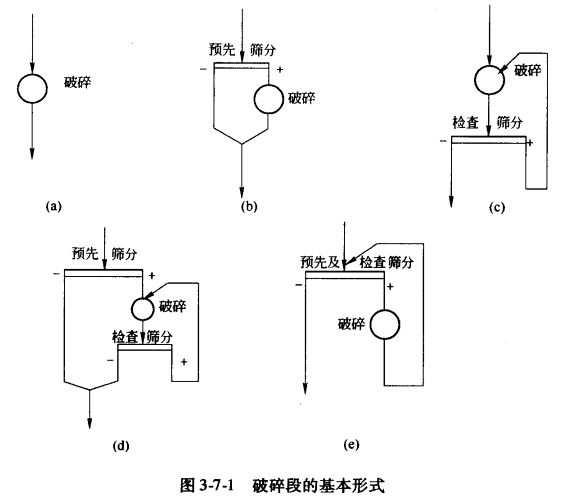 破碎段的基本形式有:如圖3-7-1所示,a為單一破碎作業(yè)的破砷段;b為帶有預(yù)先篩分作業(yè)的破碎段:c為帶有檢查篩分作業(yè)的破碎段;d和e均為帶有預(yù)先篩分和檢查篩分作業(yè)的破碎段,其區(qū)別僅在于前者是預(yù)先篩分和檢查篩分在不同的篩子上進行,后者是在同一篩于上進行,所以e可看成是d的改變。因此破碎段實際上只有4種形式。