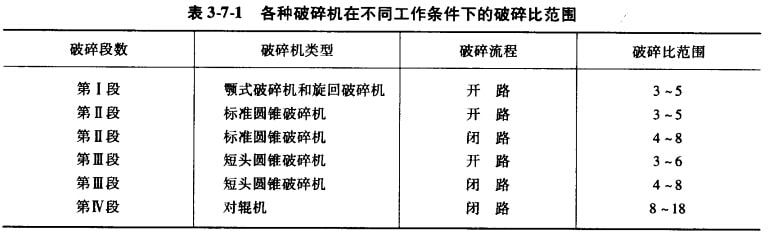 每一破碎段的破碎比取決于破碎機的類型,破碎段的形式,所處理礦石的硬度等。常用破碎機所能達到的破碎比如表3-7-1所示,處理硬礦石時,破碎比取小值;處理軟礦石時,破碎比取大值。