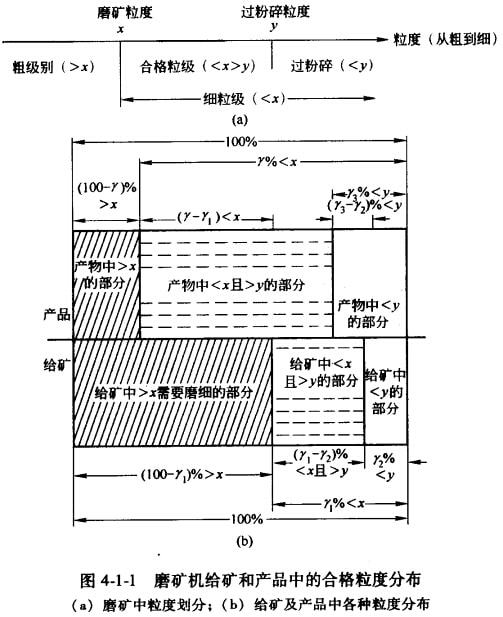 (2)磨礦技術效率E。磨礦是要將礦料磨到菜一個指定的粒度x,粒度大于x的稱粗粒級,粒度小于x的稱為細粒級;而且磨礦中指定某 一個粒度y為過粉碎粒度,粒度小于y的稱為過粉碎級別,則粒度介于x與y之間的粒度稱為合格粒級。磨礦中粒度劃分及合格粒度分布的 情況如圖4-1-1。
