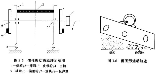 慣性振動篩由于振幅小而振次髙,適用于中、細(xì)粒物料的篩分,并且要求在給料均勻的條件下工作。因?yàn)檎穹S給礦量的變化而改變,當(dāng)給礦童加大時,篩子的振幅減小,易發(fā)生篩孔堵塞現(xiàn)象;反之,當(dāng)給礦量過小時,篩子的振幅加大,物料顆粒會很快地跳躍而越過篩面,這兩種情況都會導(dǎo)致篩分效率降低。由于篩分粗粒物料時需要較大的振幅,才能使物料松散,而且篩分粗粒時,又很難保證給料均勻,故慣性振動篩只適用于中、細(xì)粒物料,它的給料粒度一般不能超過100 mm。同時,篩子不宜制造得太大,只有中、小型選廠才宜采用。