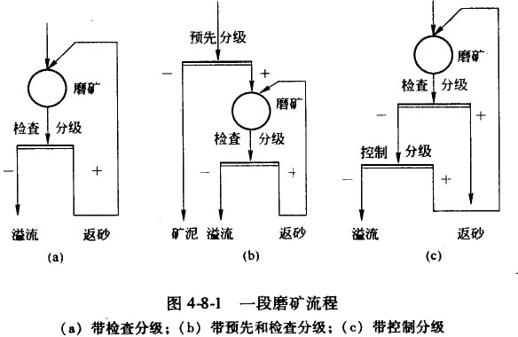 采用一段磨礦流程時(shí),磨礦機(jī)開(kāi)路工作容易產(chǎn)生過(guò)粉碎現(xiàn)象。通常,磨礦機(jī)都是與分級(jí)機(jī)構(gòu)成閉路循環(huán),常用流程有以下三種,如圖4-8-1所示。