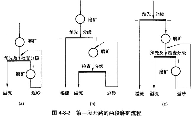 圖4-8-2中(a)流程和(b)流程的區(qū)別在于,前者的預(yù)先分級(jí)和檢查分級(jí)是合一的,后者是分開(kāi)的。采用后者有可能分出原生礦泥、原礦中所含可溶性鹽類,以及第一段磨礦時(shí)的易碎部分,它們?cè)趩为?dú)的循環(huán)中選別,可以改善選別效果。但是,由于原生礦泥和易碎部分已從第一段分級(jí)機(jī)中分出,第二段分級(jí)機(jī)只處理顆粒物料,這種情況在磨礦產(chǎn)生次生礦泥較少的結(jié)晶狀礦石時(shí).將會(huì)惡化檢查分級(jí)機(jī)的工作。流程(c)先進(jìn)行預(yù)先分級(jí),只有在含原生礦泥較多并有分出單獨(dú)處理的必要時(shí),才予采用。