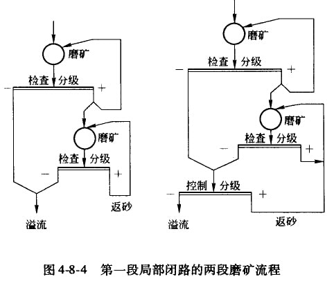 局部閉路流程的缺點(diǎn)是:返砂從第一段運(yùn)輸?shù)降诙,需要用坡度大的溜槽或采用運(yùn)輸機(jī)械;第二段磨礦的檢查分級(jí),在處理產(chǎn)生少量的次生礦泥的礦石時(shí),會(huì)引起分級(jí)機(jī)工作的困難。