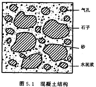 普通混授土是由水泥、砂、石子和水組成。在混凝土中,砂石材料的總含量占總體積的80%以上,主要起骨架作用,稱為骨料;水泥與水形成水泥漿,水泥漿包裹在骨科表面并填充其空隙。在硬化前,水泥漿起潤滑作用,使混援土拌合物具有一定的流動性,以滿足施 工的要求。水泥漿硬化后形成水泥石,將骨科膠組成一個堅實的整體。水泥混凝土的結(jié)構(gòu)如圖5.1。