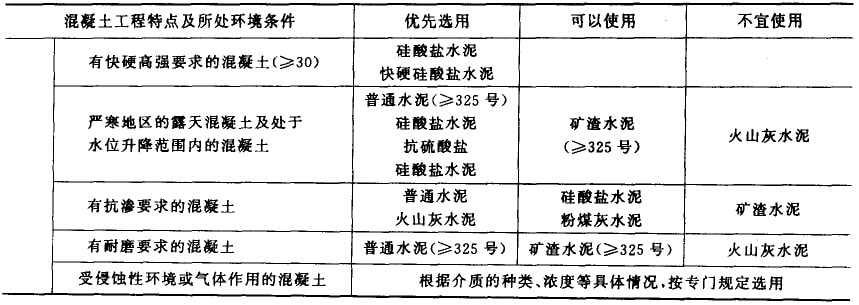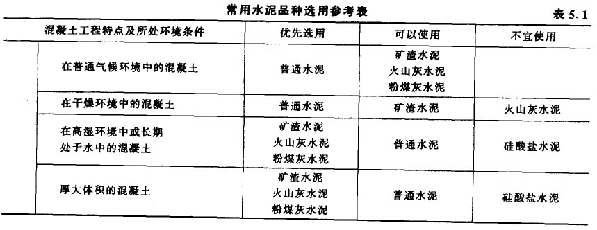 配制混凝土用的水泥,應(yīng)從工程性質(zhì)及所處的環(huán)境,結(jié)合水泥特性綜合考慮。常用水泥品種選用見表5.1。