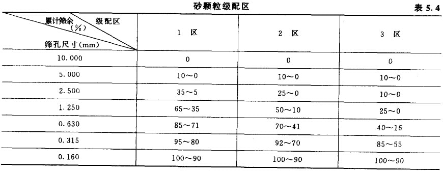 混凝土用砂的顆粒級配的累計篩余百分率處于表5.4中任何一個級配區(qū)范圍,則認為該砂的級配合格‘若有超越,只允許在2.500mm、1.250mm、0.315mm和0.160mm四個篩孔發(fā)生,且超越總雖的絕對值應(yīng)小于或等于5%,而對5.000mm和0.630mm篩孔,則不允許有超越;否則,砂的級配視為不合格。