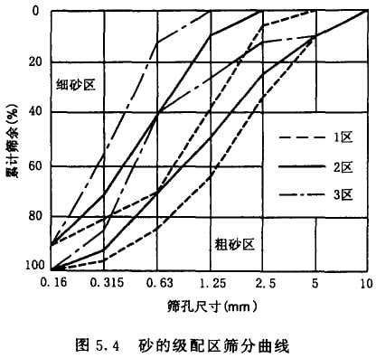 一般認為,處于級配曲線2區(qū)的砂,其粗細適中,級配較好。1區(qū)的砂含粗砂顆粒較多,屬于隨砂,其保水性差。3區(qū)的砂細砂顆粒多,用其配制的混凝土粘聚性大,保水性能好,但干縮性大,容易產(chǎn)生微裂縫。