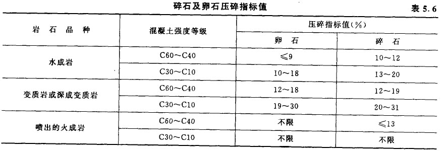 對多種巖石組成的卵石,可對20mm以下和20mm以上的標(biāo)準(zhǔn)粒級(10-20mm)分別檢驗,計算總的壓碎指標(biāo)。碎石及卵石的壓碎指標(biāo)見表5.6。