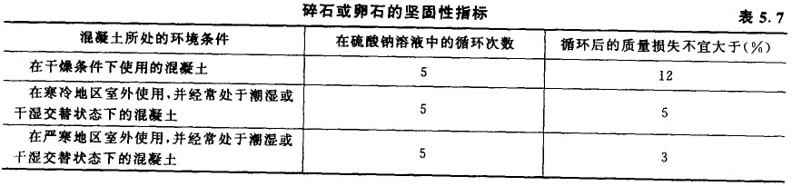 石子的堅固性是指石于在氣候、環(huán)境變化或其他物理因素作用下,抵抗碎裂的能力。常用硫酸鈉溶液,將試件經(jīng)5次循環(huán)浸泡后,要求試件質(zhì)量的損失應(yīng)符合表5.7的規(guī)定。質(zhì)量損失越少,骨料越堅固,其質(zhì)量也越好。