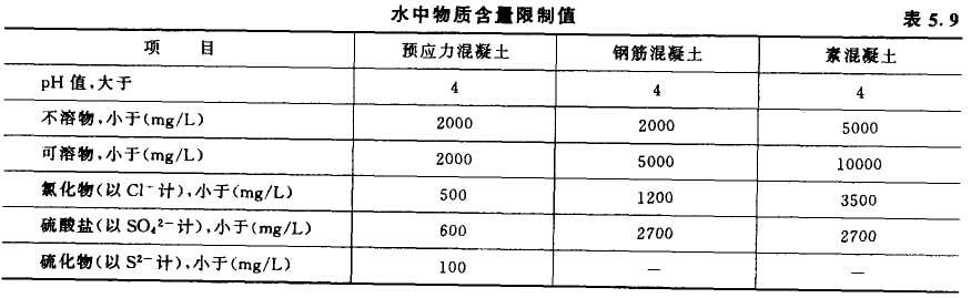 對水質(zhì)有懷疑時,應(yīng)將待檢驗水與蒸餾水分別做水泥凝結(jié)時間和砂漿或混凝土強度對比試驗。對比試驗測得的水泥韌凝時間差和終凝時間差,均不得超過30min,且其韌凝及終凝時間應(yīng)符合國家水泥標(biāo)準(zhǔn)的規(guī)定。用待檢驗水配制的水泥砂漿或混凝土的28d抗壓強度不得低于用蒸餾水配制的對比試件強度的90%;炷劣盟懈鞣N物質(zhì)含量限制值見表5.9。