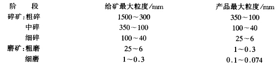 由于采礦方法、運輸條件及選礦廠規(guī)模的不同,送到選礦廠來的原料粒度也不同。目前井下開采的礦石最大塊度為200~600 mm,而露天開采的礦石最大塊度則為1200~1500 mm。選別作業(yè)所要求的入選粒度往往都很細,通常在0.3 mm以下。目前所用的碎礦和磨礦設備,由于構造上的原因,所能處理的給礦粒度和產(chǎn)品粒度,都有一定范圍,因此不可能一次就把粗大的礦塊粉碎到所要求的入選粒度。所以必須通過若干臺不同型式的碎礦和磨礦設備,逐段進行處理,而每段只完成整個粉碎過程的一部分任務。在選礦廠中"段"是根據(jù)所處理的入料和產(chǎn)品的粒度來劃分的。一般分為兩個大的階段,即碎礦階段和磨礦階段(統(tǒng)稱為粉碎段),碎礦采用兩段或三段,磨礦采用一段或兩段。各段的大致粒度范圍為: