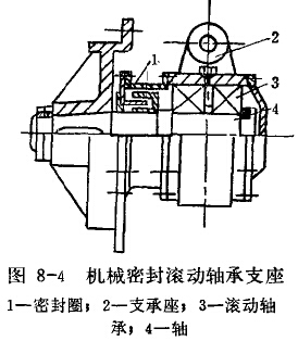 下部支座長期沉沒在礦漿中,因而軸承的密封裝置是保證設(shè)備正常運(yùn)轉(zhuǎn)的關(guān)鍵問題。目前,常用的下部軸承的密封裝置有三種,即機(jī)械密封滾動軸承支座(圖8-4)、壓力水封樹脂瓦滑動軸承支座(圖8-5)及壓力水封橡膠軸襯(一船用皮帶機(jī)廢肢帶組疊而成)。這些結(jié)構(gòu)型式的密封性均不夠理想,最近,在機(jī)械密封滾動軸承支座的基礎(chǔ)上,用手動干油泵注入高壓油,壽命可達(dá)1年左右,其結(jié)構(gòu)如圖8-6所示。