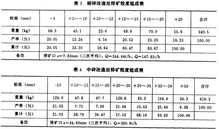 (1)檢測數(shù)據(jù)(表1-表4)表明:腔型優(yōu)化改造后,破碎效果有明顯改善。排礦細(xì)粒級(jí)增加,細(xì)碎排礦中-15mm粒級(jí)含量由44.85%增至60.47%,增加了15.62%;+20mm粒級(jí)含量由26.13%降至16.33%,降低了9.8%;中碎排礦-15mm粒級(jí)含量由22.80%增至28.78%,增加了5.98%,中碎排礦最大粒級(jí)由75mm降至50mm,+50mm粒級(jí)含量由21.28%降至6.38%,降低了14.9%。