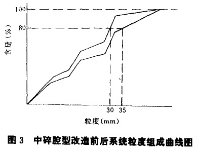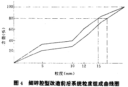 (2)腔型優(yōu)化改造前后,系統(tǒng)粒度組成比較如圖3、圖4,從圖中表明:腔型優(yōu)化改造后,系統(tǒng)粒級(jí)降低。