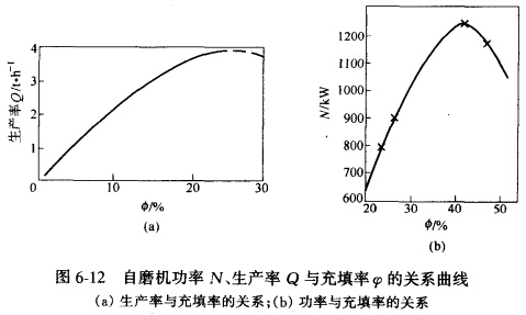 試驗表明,隨著磨機(jī)內(nèi)料位的增高,功率消耗也增加,磨機(jī)的產(chǎn)量也相應(yīng)提髙。如圖6-12所示,當(dāng)充填率增加到某一數(shù)值(36%~40%)時,功率消耗達(dá)一極限值,此時磨機(jī)的產(chǎn)量最髙,當(dāng)充填率再增加時,功率消耗急劇下降,產(chǎn)量也降低,此時磨機(jī)出現(xiàn)了"脹肚"現(xiàn)象。故對任一自磨機(jī)均存在一最佳料位值,此時磨機(jī)消耗功率為最大。物料性質(zhì)不同,最佳料位值也不同。一般為 30%~40%。通過調(diào)整磨機(jī)的給料速度,可使自磨機(jī)經(jīng)常處于最佳料位值工作。