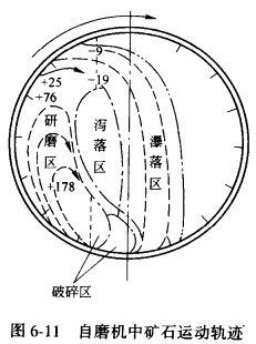 圖6-11表示礦石在自磨機(jī)中的運動軌跡。在筒 體的徑向方向上,大塊礦石處于旋轉(zhuǎn)的內(nèi)層(靠近磨機(jī)中心),瀉落運動較多,形成瀉落區(qū)和研磨區(qū),它的循環(huán)周期短,很快地下落至筒體下部,遭到瀑落下來的礦石的沖擊而磨碎。中等粒度礦石在中間層,細(xì)粒較多集中于外層,它們被提升的高度較大,細(xì)粒脫離筒壁后拋落下來形成瀑落區(qū)。瀑落下來的礦石在筒體下部與自磨機(jī)的新給礦相遇,將其擊碎。 礦塊在這一區(qū)域受到的沖擊破碎作用最強(qiáng),故稱為破碎區(qū)。礦石在破碎區(qū)和研磨區(qū)被磨碎到一定粒度后,被氣流或水帶出自磨機(jī)進(jìn)行分級。