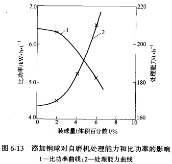 半自磨時,一般加入占磨機(jī)容積2%~8%的鋼球,作為強(qiáng)化自磨的措施之一。鋼球的作用是彌補(bǔ)礦石中粗粒級的不足和磨碎"頑石",并可從中得到高強(qiáng)度的音響信號,以正確控制給礦量 (見圖6-13),其結(jié)果是提髙生產(chǎn)率、降低比能耗,并改善產(chǎn)品的粒度組成和減少泥化現(xiàn)象,半自磨所加鋼球直徑,通常在40~130mm之間。