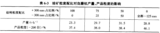 為使自磨機(jī)高效率工作,給礦中各粒級保持適當(dāng)配比是重要的。某燒結(jié)廠對給料中粒級配比的試驗結(jié)果列于表6-3。由表可知,給料中+300mm粒級和-300mm粒級各占50%時,磨礦效果最好,其產(chǎn)量與全部都是粗粒級或全部是細(xì)粒級比較,分別提高30.6%和50.5%。