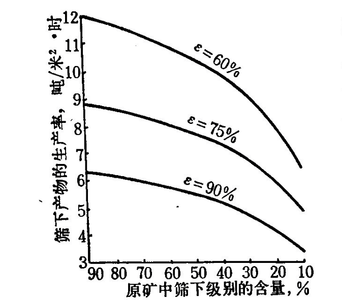 物料的粒度組成對篩分過程有決定性的影響。在任何情況下,細?偸潜却至H菀淄ㄟ^篩孔。因之,當物料內細級別含量增大時,篩子的生產率(無論按給礦量計算還是按篩下產物計算)也隨之顯著增大。下圖的曲線表示不同篩分效率時生產率(按篩下產物量計算)與原物料內細粒級別含量之間的關系。由圖可以看出,當原物料內篩下級別的含量由10%增加到90%時,篩子的生產率幾乎增大一倍。這是因為當篩下級別含量大的物料給到篩上時,細粒就很容易且迅速通過篩孔,而留在篩上的物料就很少了,這時即使在篩上物料內還有一些"難篩顆粒",相對地比較容易通過篩孔,因為其他的礦粒對它們的影響也小。反之,當原物料內篩下級別含量少時,因為整個篩面幾乎被篩上產物所占據,妨礙了細粒子通過篩孔,因此在保證篩分效率相等的條件下,按給礦量計算的生產率也就降低了。所以當原物料中細級別少,而粗級別的粒度又比篩孔尺寸大得很多的時候,有的生產廠為了提高篩子的生產能力和延長篩網的使用壽命采用雙層篩作單層篩使用。上層篩孔較大的輔助篩網預先排出過粗的級別,然后下層篩對含有大量細級別的較細物料進行最終篩分。