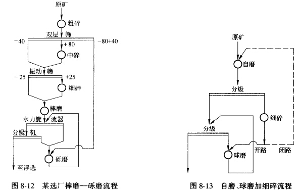 對(duì)于不適合于用自磨機(jī)組磨的硬度較大的礦石,可采用先將礦石破碎后再用棒磨機(jī)作為第 一段粗磨,從破碎產(chǎn)物中篩出部分礫石作為礫磨機(jī)介質(zhì)進(jìn)行第二段細(xì)磨的兩段半自磨流程,我國(guó)某銅礦選礦廠就是采用這種棒磨加礫磨流程的,如圖8—12所示,該廠處理的是含銅矽卡巖類型礦石,普氏硬度系數(shù)f=12—16,要求磨礦紉度為—200目占65%。實(shí)踐表明,這種流程對(duì)礦石的適應(yīng)性較廣泛,礫石的大小和數(shù)量易控制,生產(chǎn)條件比較穩(wěn)定,操作容易掌握。礫磨中的難磨粒級(jí)是通過間斷排出并送回棒磨機(jī)再磨的辦法來處理的。