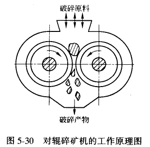 對輥破碎機的工作原理如圖5-30所示。物料從上面加入破碎機,兩個圓輥相向旋轉(zhuǎn),由于物料與輥面的摩擦力將物料卷入破碎腔小,被輥子所壓碎。已破碎的礦石,在重力作用下,從兩個輥子間的間隙處排出。