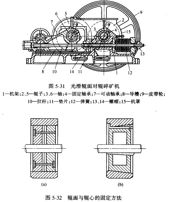 對輥碎礦機的構(gòu)造如圖5-31所示;對輥碎礦機的一個輥子2安裝在軸3上,軸3在固定于機架1上的軸承4中旋轉(zhuǎn),另一個破碎輥5(稱可動輥)則安裝在袖6上,軸6在可以滑動的軸承7中旋轉(zhuǎn)。軸承7是由拉桿10,墊片H、彈簧1Z、螺帽14和夾緊螺帽13固定在導(dǎo)槽8上。軸3和6的旋轉(zhuǎn),可以分別用兩個電機帶動,也可用一個電機通過天軸傳動使兩個軸旋轉(zhuǎn),或采用專門的長齒齒輪帶動兩個袖旋轉(zhuǎn)。皮帶輪9又起褐輪的作用。
