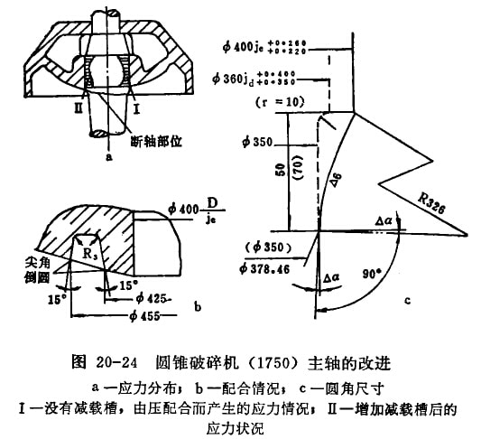 (3)在保證主軸與軀體緊配合,運(yùn)轉(zhuǎn)中不發(fā)生松動(dòng)的情況下,減小主軸與圓錐軀體的配合過盈,以適當(dāng)緩和應(yīng)力集中。例如舊系列φ1650主軸用D/Jd配合;新系列φ1750破碎機(jī)改為D/j配合(圖20-24b)。