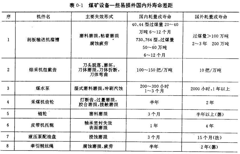 另一方面,我國(guó)礦山機(jī)械設(shè)計(jì)相制造過(guò)程中由于受傳統(tǒng)習(xí)慣的束縛,及對(duì)摩擦學(xué)知識(shí)缺乏了解,不能將當(dāng)今國(guó)內(nèi)外先進(jìn)的抗磨技術(shù)相耐磨材料及時(shí)地應(yīng)用在礦山機(jī)械設(shè)計(jì)制造上,造成我國(guó)礦山機(jī)械易磨損機(jī)件的使用壽命遠(yuǎn)遠(yuǎn)低于國(guó)外先進(jìn)水平。具體情況見表0-1。