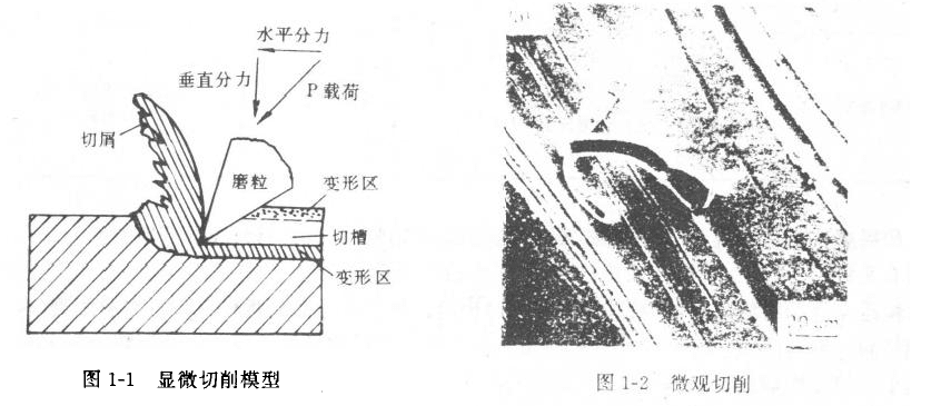 磨粒作用在金屬材料表面上,磨料上承受的就荷P可分為法向分力都切向分力。在法向分力作用下,磨料的棱角刺入材料表面,在切問(wèn)分力作用下,磨粒沿平行于表面方向滑動(dòng),帶有銳利棱角并具有合適的迎角的磨粒能切削材料而形成切屑(見(jiàn)圖1-1)。圖1-2是一典型的磨粒切削材料而形成顯微切屑過(guò)程的照片?梢钥闯,切屑仍然立在淡面上,黑色的磨粒仍然鑲嵌在切屑的根部。磨粒切削過(guò)程使材料表面產(chǎn)生某種校度的理性變形,圖1-2上還可以看到劃痕兩邊戲留的剪切皺折。這種切削過(guò)程與機(jī)加工過(guò)程產(chǎn)生的切屑極為相似,只是體積小些、故稱為微觀切削。