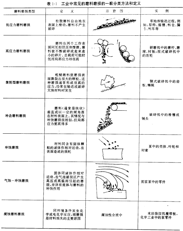 由粗糙硬表面把較軋的工作表面劃傷,或者工作表面受外界硬粒劃傷,都用于磨料磨損。在礦山機(jī)械、工程機(jī)械、農(nóng)業(yè)機(jī)械等行業(yè)戶與泥沙、礦石或灰渣等立按摩擦。都會(huì)發(fā)生不同形式的磨料磨損。據(jù)統(tǒng)計(jì),因磨料磨損而造成的損失占整個(gè)工業(yè)范圍磨損損失的50%。對(duì)磨料磨損的分類很多文獻(xiàn)都習(xí)慣引用Avery和Rigney的分類法(見(jiàn)表1-1)。