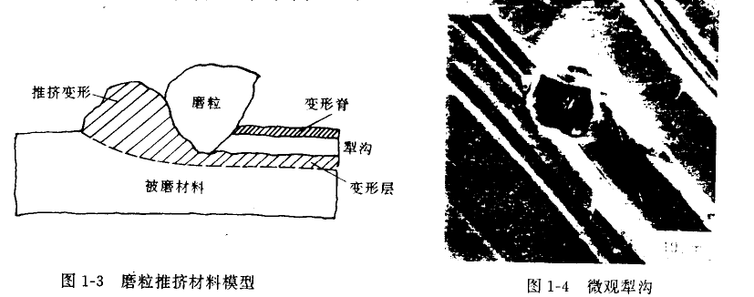 如果磨粒不夠尖銳,或刺入材料表面角度不適合切削,則會(huì)將材料表面擠出犁溝。犁溝變形有兩種:一種是由于磨粒推擠材料,使之堆積在廟版運(yùn)動(dòng)的前方,當(dāng)堆積增高后就會(huì)阻礙磨粒運(yùn)動(dòng)直到磨粒破碎,或被其他磨粒破碎帶走。第二種是磨粒將材料擠向溝槽兩側(cè)(也可能擠向一側(cè)),圖l-3所示為帶有負(fù)前角的磨版推擠材料的模型。圖1-4是磨粒推擠材料形成犁溝的過(guò)程照片。磨粒犁溝材料表面并不能一次產(chǎn)生磨屑,而是當(dāng)?shù)谝粋(gè)磨粒推擠材料表面形成犁詢后,已經(jīng)使溝榴底部或溝槽兩側(cè)金屆發(fā)生—“定程度的塑性變形,后繼的磨粒可能切削金屬或繼續(xù)推擠已經(jīng)發(fā)生理性交形的犁溝構(gòu)底或兩側(cè),當(dāng)磨粒多次使金屬變形且變形程度超過(guò)材料允許的延伸極限后,變形材料表面就會(huì)產(chǎn)生裂紋,裂紋擴(kuò)展,形成薄片狀磨屑,這一磨損過(guò)程被稱為微觀犁溝(圖1-4)。