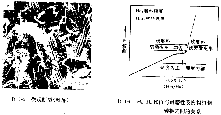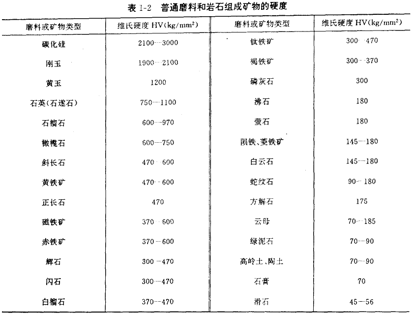 由此可見,當(dāng)磨料硬度遠(yuǎn)遠(yuǎn)大于材料硬度時,磨損嚴(yán)重,磨損與材料硬度無關(guān);當(dāng)材料硬度接近于磨料硬度時,隨比值的增大,磨 損急劇減小。應(yīng)該指出的是,即使是很軟的磨料,由于沖擊作用或者其中滲有硬磨料等因素,也會導(dǎo)致工件的磨損。因為實際磨料的硬 度和材料硬度都不是一個單一的數(shù)值而是一個分布值(見圖1-8)。因而,即使工件的平均硬度值超過磨料的平均硬度值,由于磨料與 材料硬度的統(tǒng)計分布關(guān)系也會引起磨損。這就說明了為什么煤炭的硬度不高,但對煤炭機(jī)械造成的磨損仍然是十分嚴(yán)重的事實。表1-2 表示了各種磨料類型及巖石硬度值。
