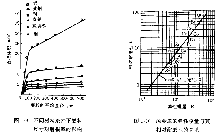 磨料的尺寸粒度對磨損也有一定的影響(見圖1-9)。當(dāng)磨料在某一臨界尺寸以下時,體積磨損隨磨料尺寸的增加而急劇地按比例增加 ;當(dāng)超過一臨界尺寸后,磨損增大的幅度顯著降低。