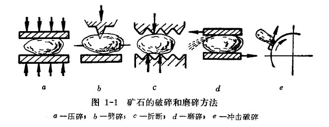 (4)磨碎(圖1—1d):礦石與運動的表面之間受一定的壓力和剪切力作用后,其剪應(yīng)力達(dá)到礦石的剪切強(qiáng)度限時,礦石即被粉碎。磨碎的效率低,能量消耗大。