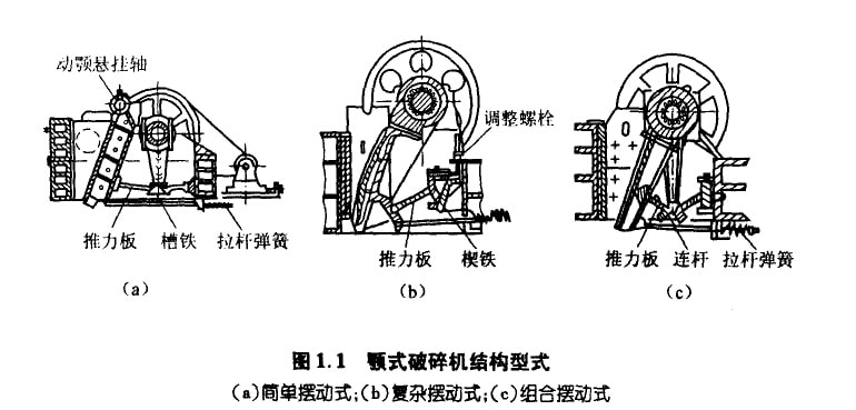 顎式破碎機按活動顎板的運動狀態(tài)可分為簡單擺動、復(fù)雜擺動和組合擺動三種類型,如圖1.1所示。圖中(b)和(c)型顎式破碎機 的共同特點是:物料塊在破碎顎板之間除受擠壓作用外,同時還受研磨力的作用,因此破碎效率較高。顎式破碎機排料口的大小,可通 過調(diào)整座楔塊的升降進行調(diào)節(jié)。設(shè)備的安全裝置由支承動顎的肘板兼顧,當(dāng)破碎腔內(nèi)進入堅硬異物時,設(shè)備超員荷運行致使肘板首先斷 裂,從而使設(shè)備受到保護。