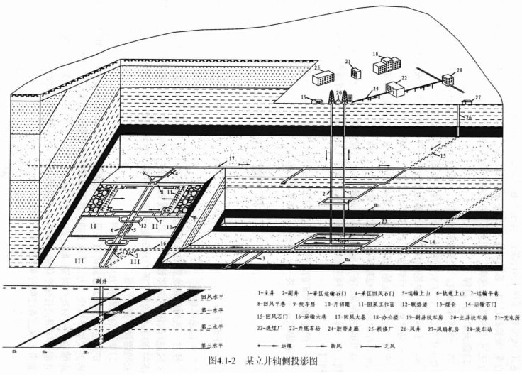圖4.1-2是某礦井(立井)生產(chǎn)過程的軸側投影圖。從圖中可以看出,該礦井開采三個煤層。為了開采和運輸煤炭,需要開掘的井巷有:主井、副井、并底車場、石門、運輸大巷、回風大巷、采區(qū)上山、煤倉、運輸平巷、回風平巷,回來工作面等。從井下提運到地面的煤,需要經(jīng)過加工后裝車外運,故還需要在地面工業(yè)場地布置主副井井架、浴室燈房聯(lián)合建筑、皮帶走廊、選煤廠、機修廠、辦公樓等地面建構筑物。