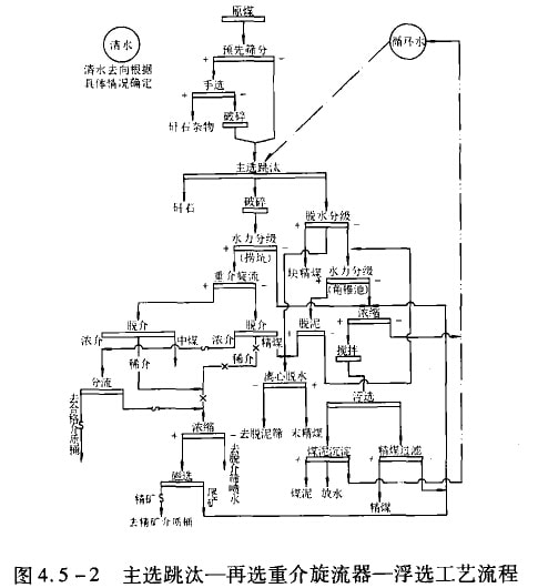 2)主選跳汰一再選重介族流器一浮選工藝流程見圖4.5-2。為提高煉焦煤回收率,中煤含量大的煉焦煤可采用這種流程。