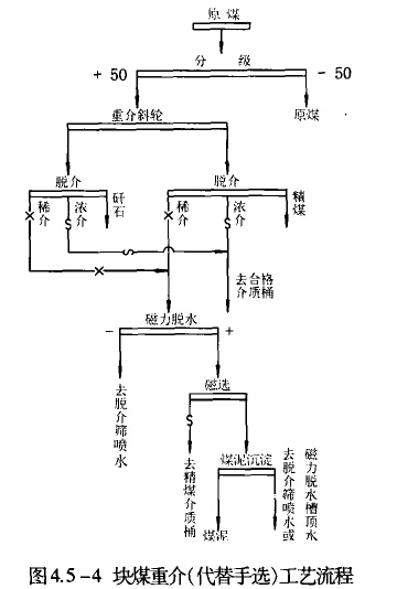 4)塊煤重介(代替手選)工藝流程見圖4.5-4。塊煤含量多的煤,特別是露天開采的原煤,為取消繁重的揀殲作業(yè),有效地提高煤質(zhì).并充分回收煤炭資源,常采用這種流程。