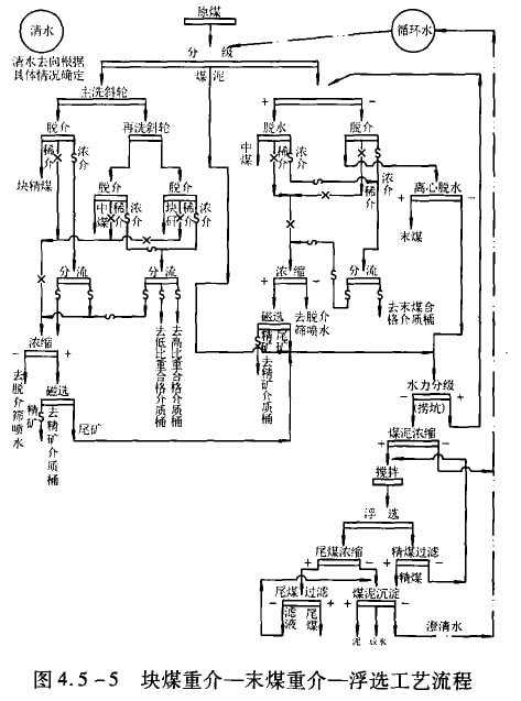 5)塊煤重介一未煤重介一浮選工藝流程見圖4.5-5。這種流程適用于難選煤、極難選煤或較稀缺的煉焦用煤。